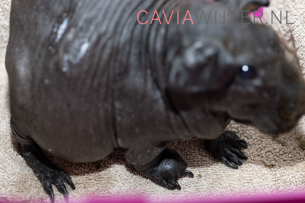 Pododermatis – het medische woord voor voetzoolontsteking kun je herkennen aan een dikkere, opgezwollen poot of meerdere pootjes (zie foto 1). De cavia kan wat moeilijker lopen of zitten. Pododermatitis komt relatief veel voor bij skinny cavia’s.